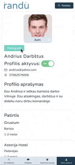 Aktyvuoti profilį reikia taip: 1) spaudi aktyvavimo mygtuką 2) nurodai miestą, kuriame ieškai darbo 3) trumpai aprašai save ir ko ieškai