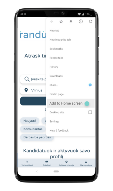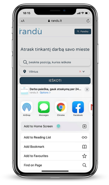 Navyguok į nustatymus ir pasirink "Add to Home Screen" pasirinkimą.