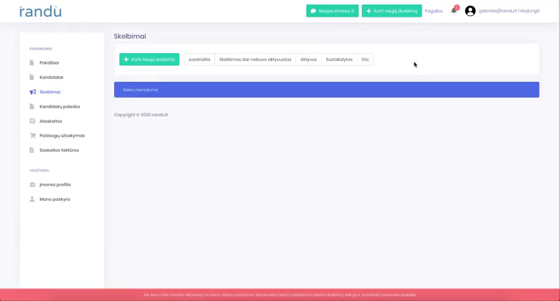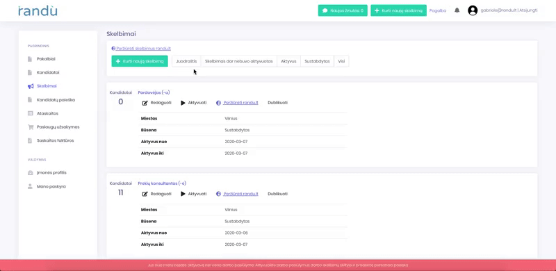 Užpildžius visą skelbimo informaciją ir pridėjus klausimus liks aktyvuoti skelbimą. Norint tai padaryti, Jums reikės nueiti į skiltį Skelbimai ir paspausti ikoną Aktyvuoti. Jei skelbimą norite sustabdyti - tai galite padaryti paspaudus ikoną Sustabdyti bet kuriuo metu.