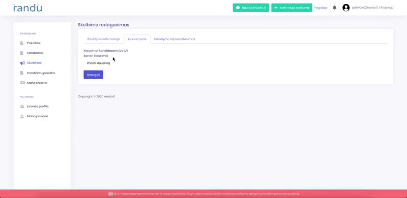 Klausimus kandidatui galite pridėti užpildžius skelbimo informaciją arba redaguojant skelbimą.